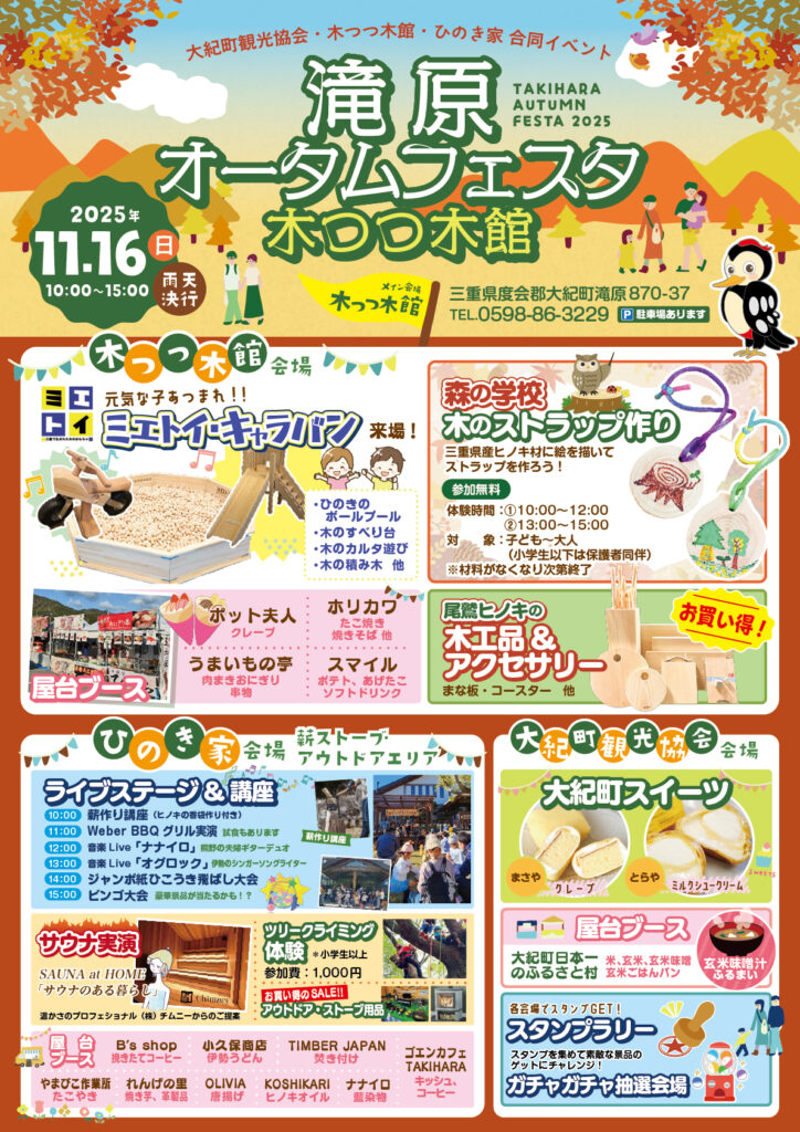 アクティブ派もまったり派も大満足!別会場の「ひのき家」では、秋の自然を満喫できるイベントが盛りだくさん!